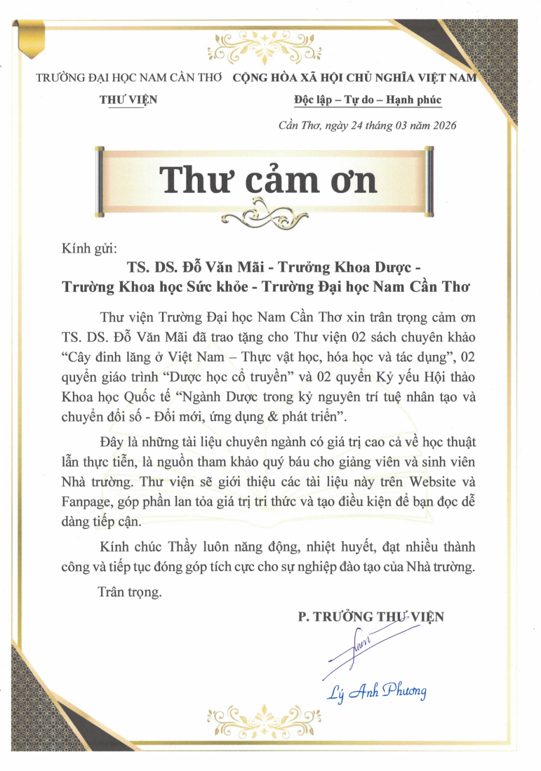 Thư cảm ơn của Thư viện gửi đến TS. DS. Đỗ Văn Mãi